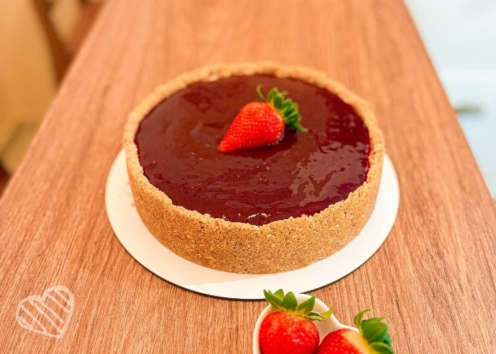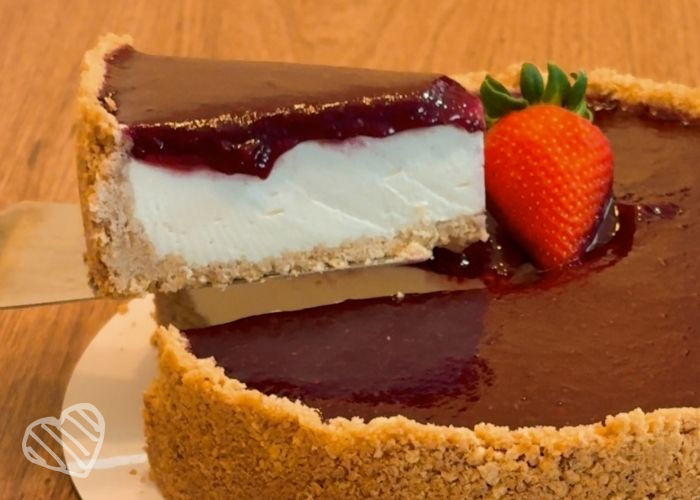 Base crocante com recheio de creamcheese e cobertura de geleia artesanal de frutas vermelhas. A base e recheio do cheesecake são assados, portanto mais cremosos. O recheio não é com gelatina.
