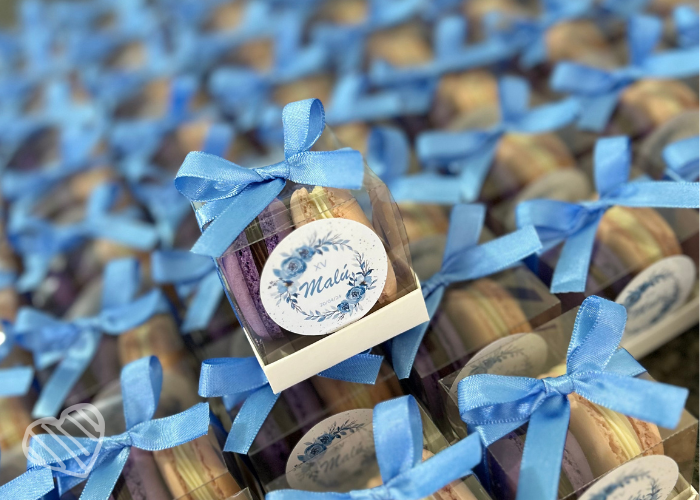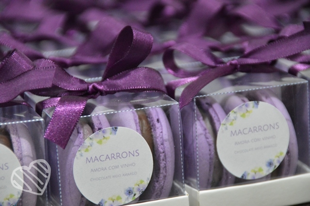 Macarons lindos e gostosos preparados com farinha de amêndoas extra fina e recheio de ganache. Embalado em caixinha de acetato transparente com fita cetim e etiqueta adesiva.