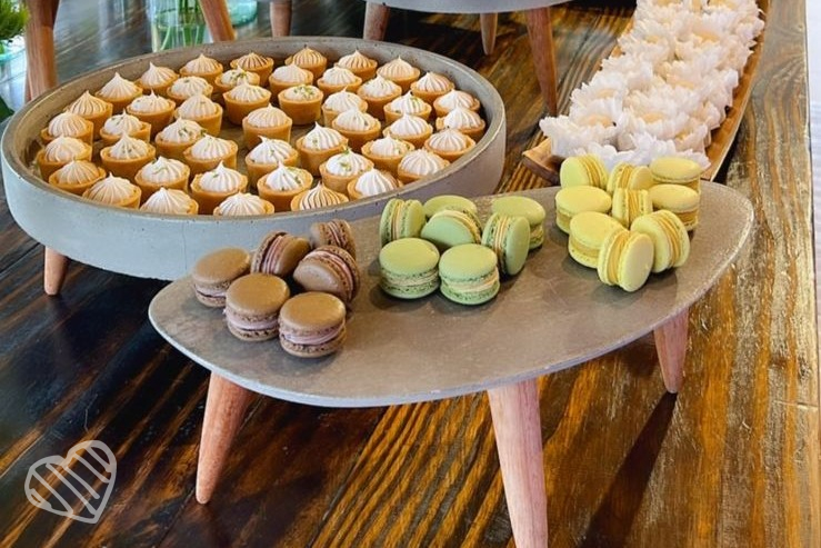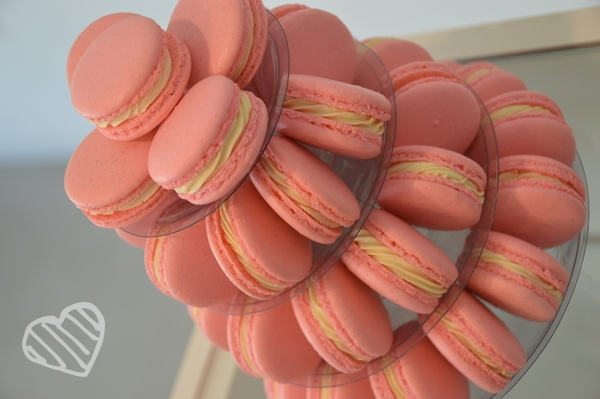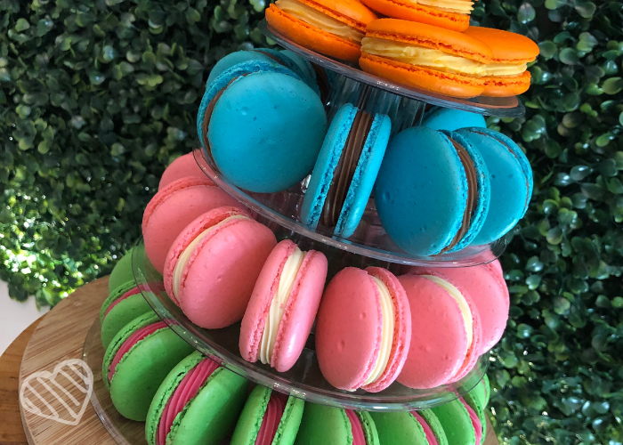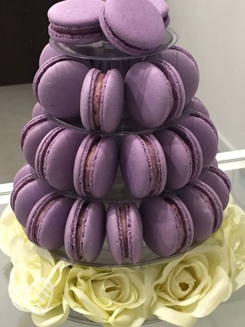 Macarons lindos e gostosos preparados com farinha de amêndoas extra fina importada e recheio de ganache. Acompanha torre plástica transparente de 4 andares + 40 macarons.