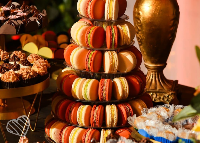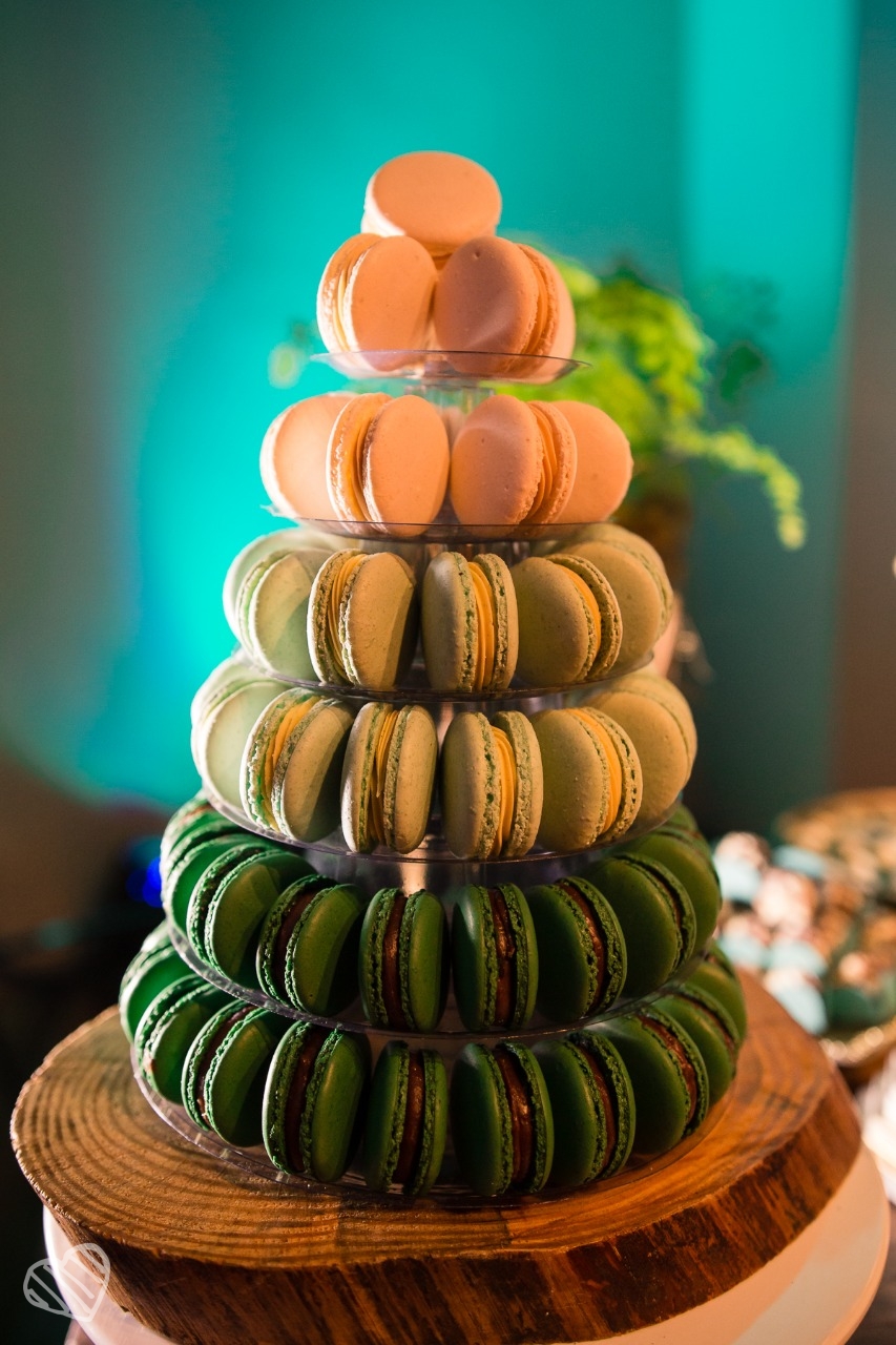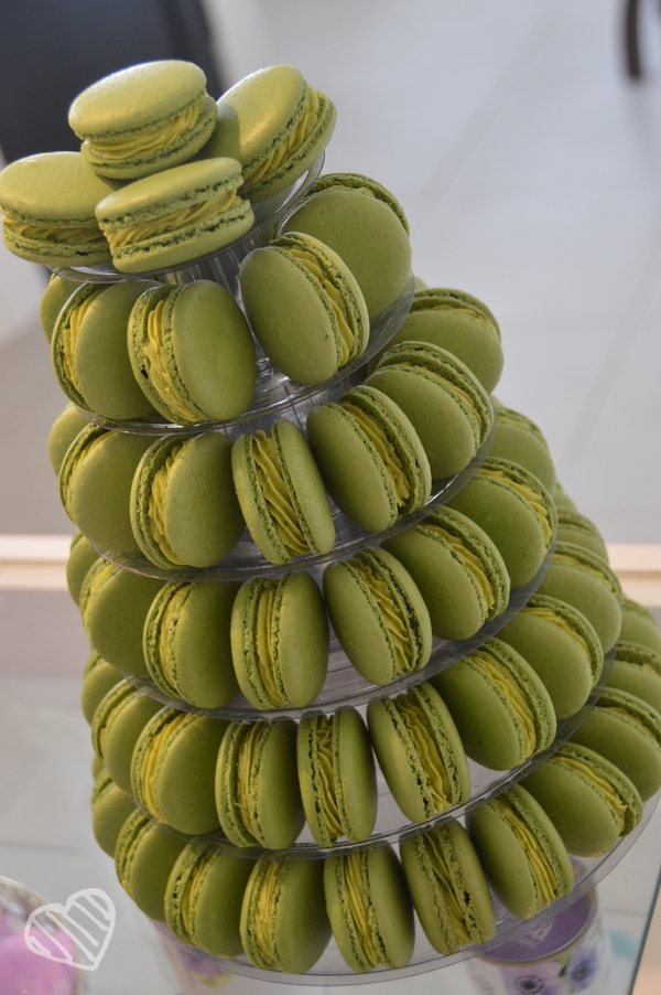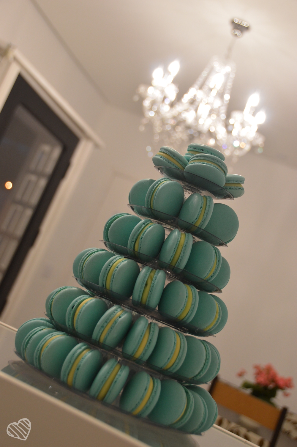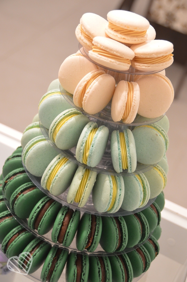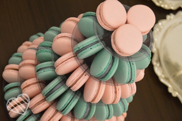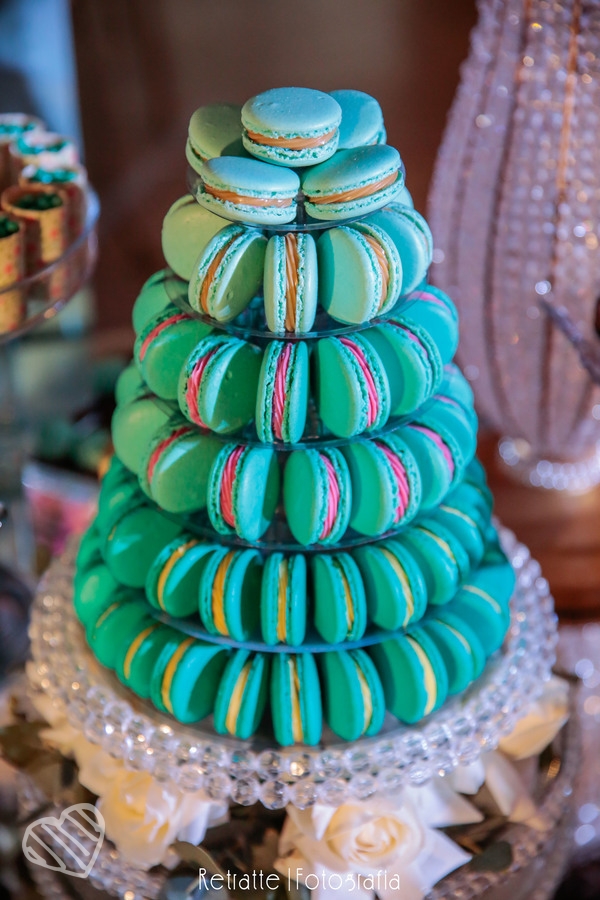 Macarons lindos e gostosos preparados com farinha de amêndoas extra fina importada e recheio de ganache. Acompanha torre plástica transparente de 6 andares + 80 macarons.