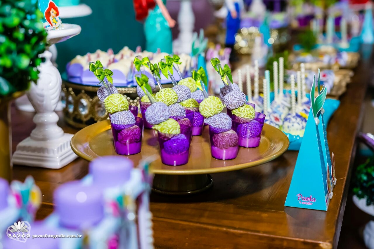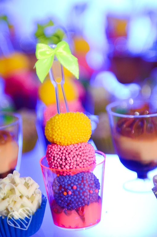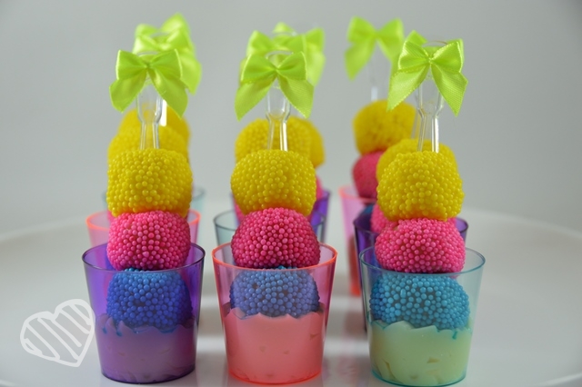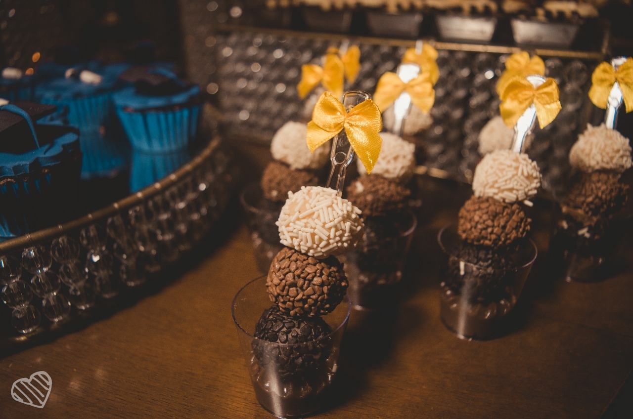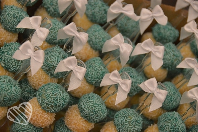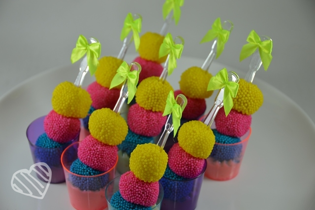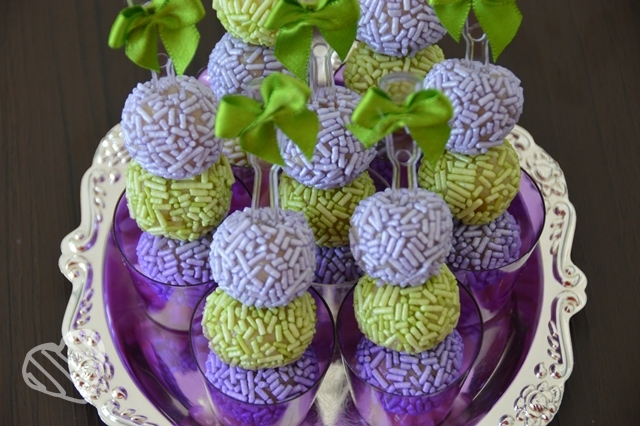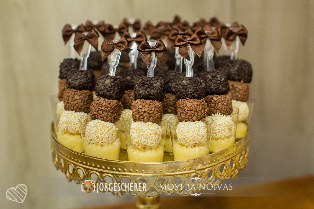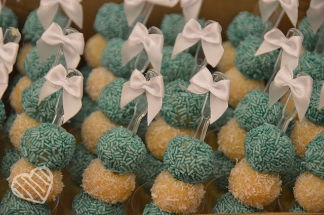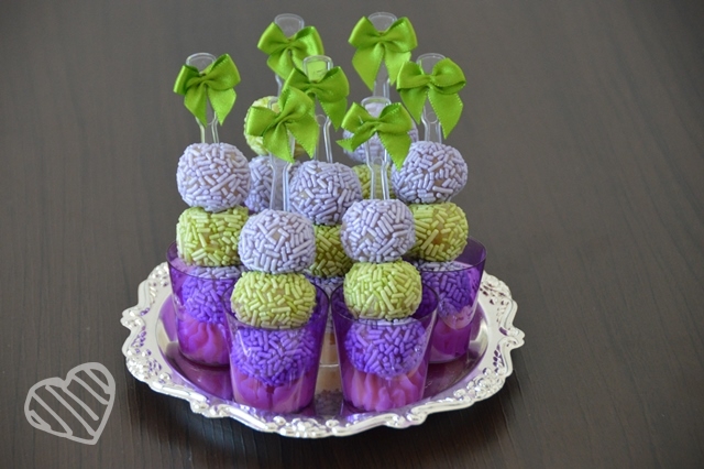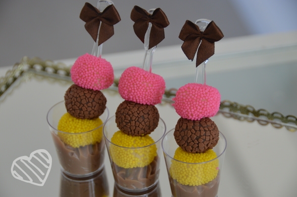 3 brigadeiros no palito com brigadeiro de colher no copinho de acrílico. Acompanha laço de fita.