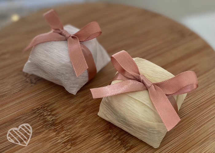 Acompanha embalagem simples (papel crepom nas cores creme, branco, prata ou dourado e fita cetim).