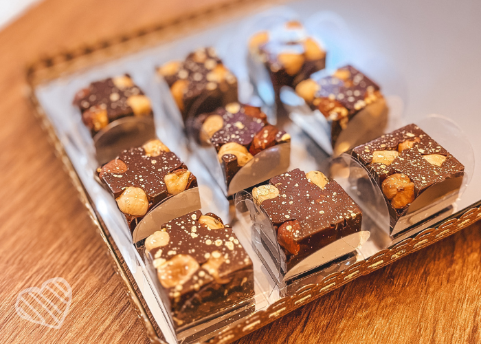 Casquinha de chocolate branco pintado de dourado com recheio de ganache de damasco.