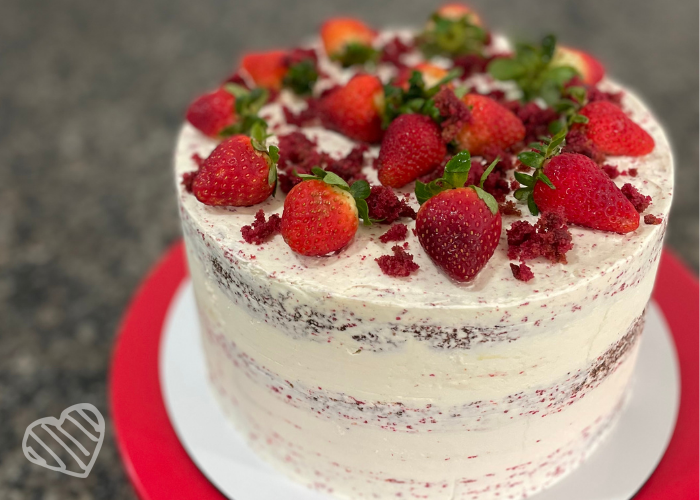 Massa amanteigada de red velvet com recheio de brigadeiro de cream cheese e geleia de frutas vermelhas. Decoração de buttercream de merengue suíço com morangos.